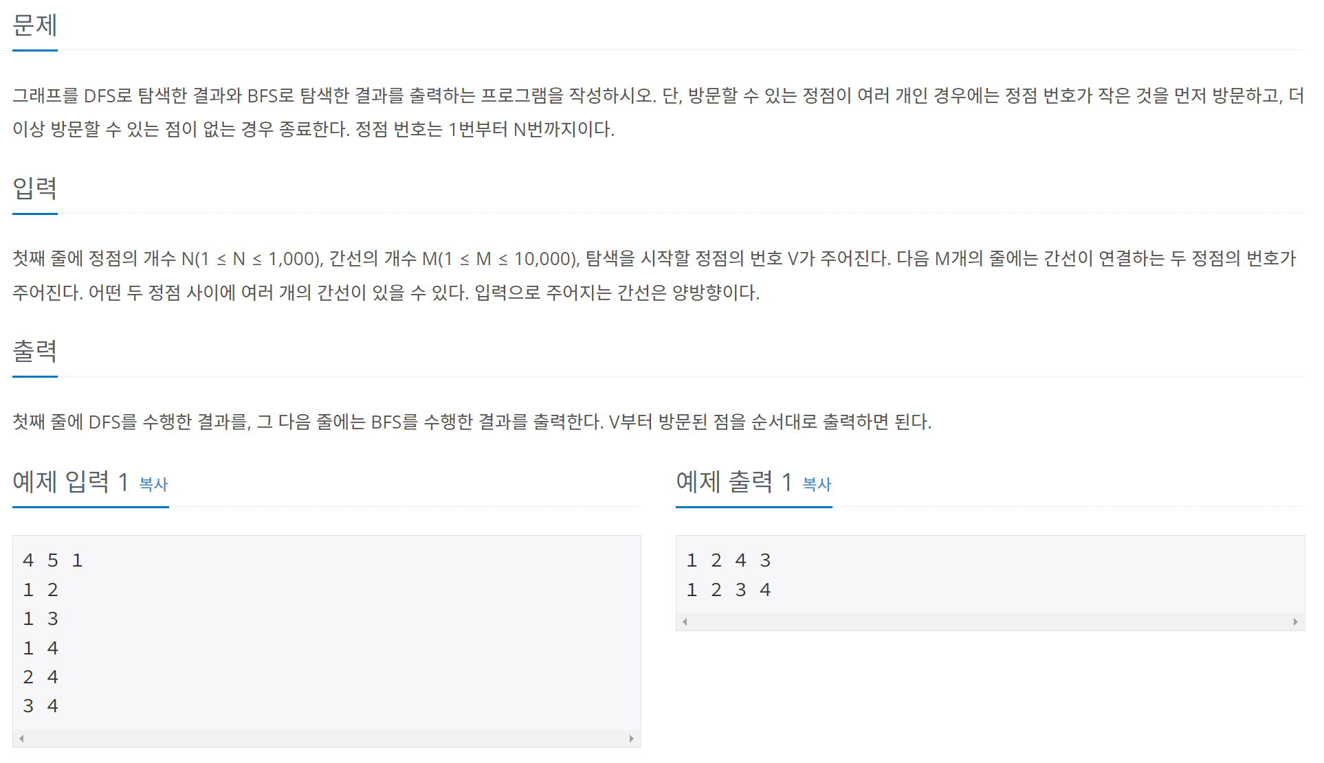 1 2 3 4 5 6 7 8 9 10 11 12 13 14 15 16 17 18 19 20 21 22 23 24 25 26 27 28 29 30 31 32 33 34 35 36 37 38 39 40 41 42 43 44 45 46 47 48 49 50 51 52 53 54 55 56 57 58 59 60 61 62 63 64 65 66 67 68 69 70 71 72 73 | import java.io.BufferedReader; import java.io.IOException; import java.io.InputStreamReader; import java.util.ArrayList; import java.util.List; import java.util.StringTokenizer; public class Main { public static int n, m, v; public static boolean[] visited; public static boolean[][] dp; public static List<Integer> q; public static void main(String[] args) throws IOException { // 1. input BufferedReader br = new BufferedReader(new InputStreamReader(System.in)); StringTokenizer st = new StringTokenizer(br.readLine()); n = Integer.parseInt(st.nextToken()); // 정점의 개수 m = Integer.parseInt(st.nextToken()); // 간선의 개수 v = Integer.parseInt(st.nextToken()); // 시작 번호 visited = new boolean[n + 1]; dp = new boolean[n + 1][n + 1]; for (int i = 1; i <= m; i++) { st = new StringTokenizer(br.readLine()); int a = Integer.parseInt(st.nextToken()); int b = Integer.parseInt(st.nextToken()); dp[a][b] = true; dp[b][a] = true; } dfs(v); System.out.println(); bfs(); } public static void dfs(int v) { visited[v] = true; System.out.print(v + " "); for (int i = 1; i <= n; i++) { if (!visited[i] && dp[v][i]) { dfs(i); } } } public static void bfs() { q = new ArrayList<>(); visited = new boolean[n + 1]; q.add(v); visited[v] = true; while (!q.isEmpty()) { int idx = q.remove(0); System.out.print(idx + " "); for (int i = 1; i <= n; i++) { if (!visited[i] && dp[idx][i]) { q.add(i); visited[i] = true; } } } } } | cs |