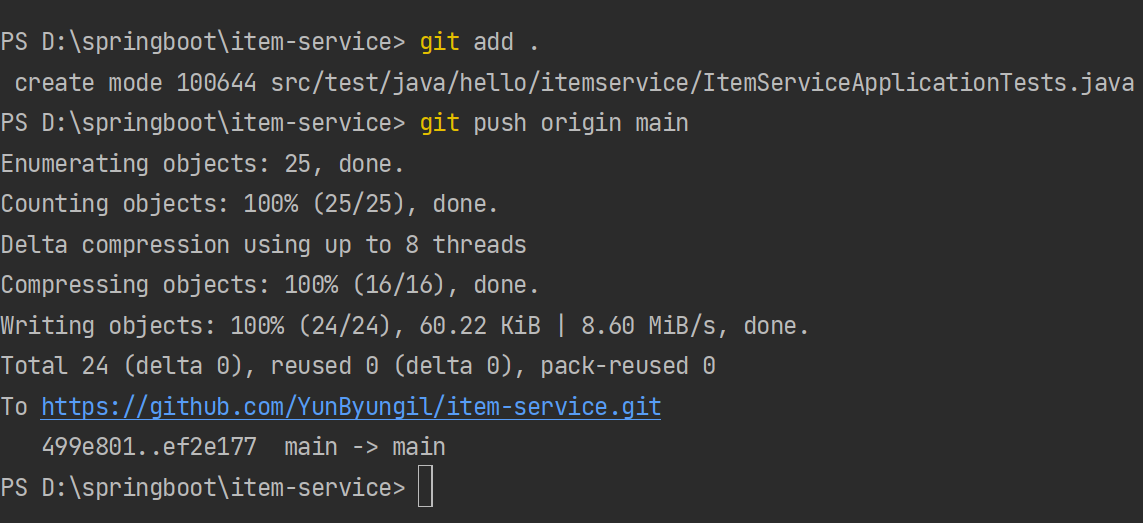 6. 인텔리제이 내부 Terminal을 이용해서 이 정보를 Git Repository에 담아주면 된다.