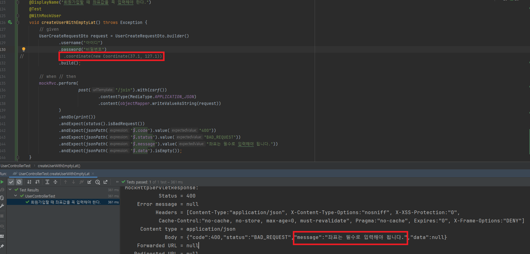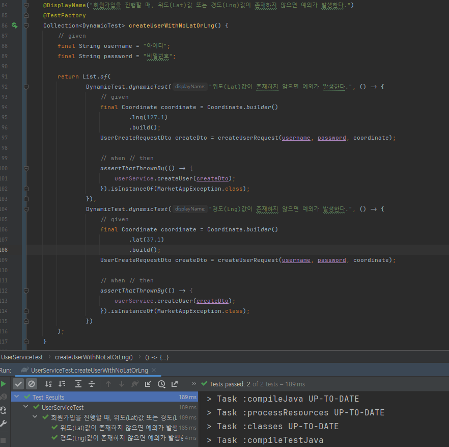 따라서 Service에서 값이 들어있는지에 대한 유무와 제대로 된 좌표값을 입력했는지에 대한 테스트를 더 추가하기 위해서는 Service에서 테스트하는 것이 맞다고 생각합니다.