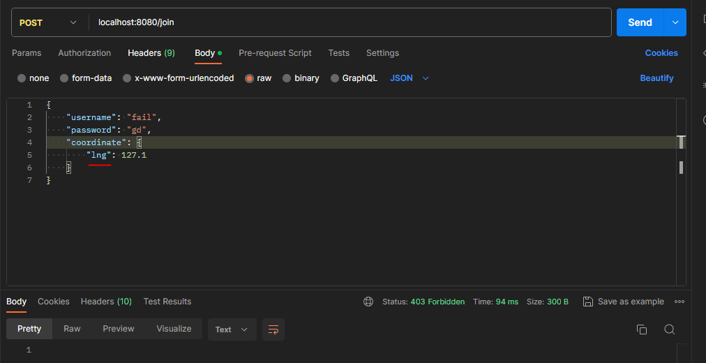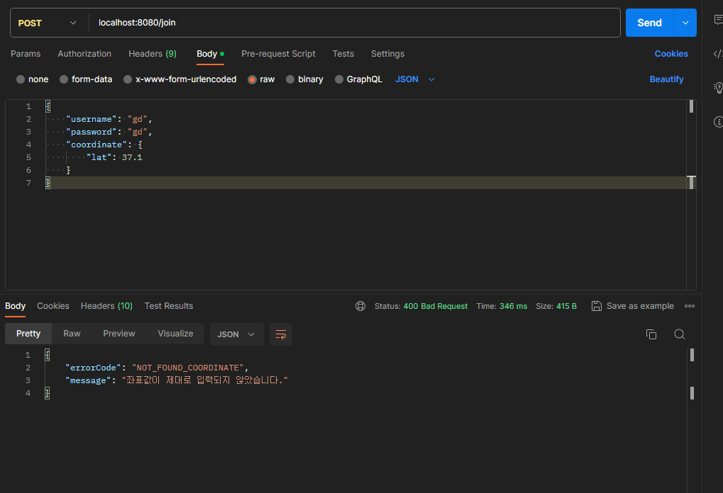 lat값 또는 lng값이 들어있기만 하면, Coordinate값이 null이 아니기 때문에 Controller 단에서 예외가 발생하지 않고,