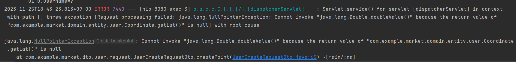 서비스에서 Coordinate의 lat값과 lng값을 이용할 때 예외가 발생하는 모습입니다.