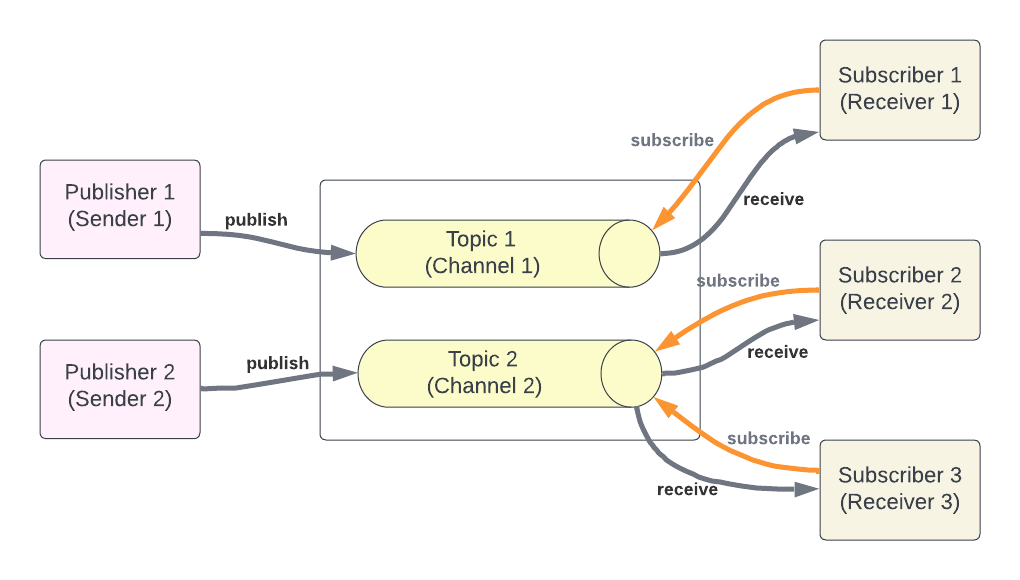 구독 대상이 되는 채널 (ChannelTopic)과 해당 채널에 메세지가 발행되었을 때 핸들링 하는 메소드(MessageListener)를 등록해줄 수 있습니다.